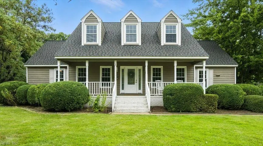 NEW roof, NEW paint, NEW carpet - Oh My! It's a must to check out this 5-bedroom, 4 full bath Cape Cod home on over half an acre in a quiet cul-de-sac of Broad Bay Estates. With 3,267 sqft of living space, the first level features a formal dining room, eat-in kitchen with granite countertops and “printless” stainless steel appliances, large family room, full bath with exterior door for easy pool access, primary suite with direct deck access and expansive ensuite with dual sinks, jetted tub, and tiled shower, plus another ensuite bedroom and an office/5th bedroom. Upstairs includes a full bath and 2 bedrooms with dormer windows, one with an extended sitting area. Outside offers a multi-level deck, in-ground saltwater pool, large fenced yard, and wooded views—great for relaxing or entertaining. Enjoy the civic league and no HOA. Located near Cox High, Chesapeake bay beaches, and the VB oceanfront. A rare find offering space, privacy, and comfort in a prime location!