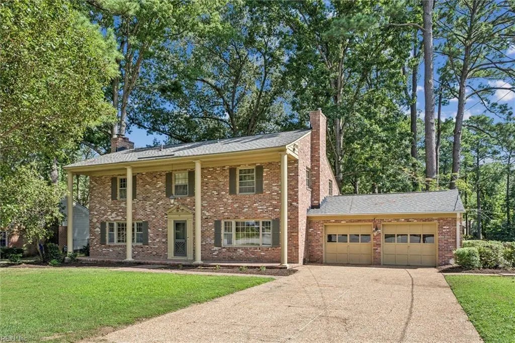Waterfront brick Colonial on peaceful Garland Lake. This traditional home offers 5 spacious bedrooms, including a primary suite with a spa-like bathroom and a private balcony overlooking the water. Hardwood floors flow throughout, and the large kitchen with stainless steel appliances also captures serene lake views. The home features two fireplaces—one gas and one wood-burning—adding warmth to the living areas. In the main living room, exposed brick and wood beams bring extra character and charm. A sunroom with a wet bar creates the perfect space for entertaining, while the expansive patio offers panoramic views of the lake. Conveniently located near CNU, the Noland Trail, shopping, dining, and more.