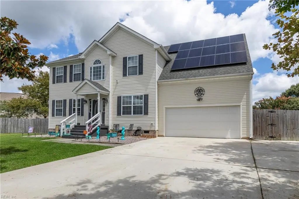 Dive in to this beautiful home on a quiet Cul-de-sac, Sought after neighborhood and near great schools! Not far from shopping and restaurants, 5 bedrooms!! and 3 1/2 full bathrooms. Large master bathroom with double sink and large master closet. Fresh paint through out, beautiful new flooring downstairs New granite counter tops, stainless steel appliances in the kitchen, Newer refrigerator. Newer roof, upstairs a/c. Amazing inground pool. With still a large yard for outside entertaining! Plenty of room for a growing family. Come see this one today. Solar panels to be paid off at closing by the seller.
