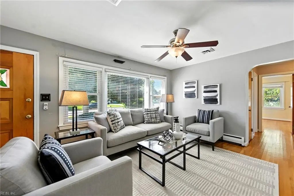 Welcome to this spacious ranch home with almost 1500 sq ft of comfortable living. A versatile bonus room provides the perfect opportunity for a 4th bedroom, home office, game room, or playroom. Inside you'll find wood floors throughout, a cozy fireplace, and a kitchen with an abundance of cabinetry. Step outside to enjoy a large covered patio overlooking the spacious yard, perfect for entertaining, gardening, or simply relaxing. The property also features a detached 2 car garage, storage shed, and an extended driveway for ample parking. Located just minutes from the Coliseum and Peninsula Town Center, you'll enjoy convenient access to shopping, dining, entertainment, and major highways. Make an appointment to see this home today!