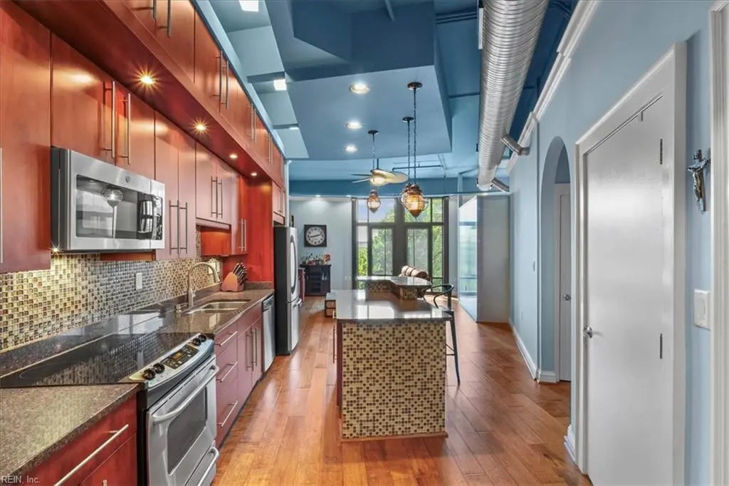 Welcome to The Rotunda premier industrial urban living in the heart of Norfolk! This 4th-floor city loft offers stunning skyline views and a secure, elevator access building . New HVAC, beautiful hardwood flooring, and cozy carpeted bedrooms. Two pets allowed with no weight or breed restrictions and a new dog park has been built .The custom-built kitchen features floor-to-ceiling cabinetry, under-cabinet recessed lighting with dimmers, and stylish upgraded fixtures throughout. Enter the spacious foyer offering plenty of storage. The living room boasts custom media cabinetry, and exceptional wood trim and paint adds warmth and character across the unit. A spacious cable closet doubles as bike storage. Condo fees include water, sewer, trash, grounds maintenance, elevators, and a full building back up generator so you’re never without power. Located near Waterside District, Tide light rail, shopping, dining, and the Tides baseball stadium.